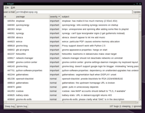 Once you have triaged some bugs, they will appear in the main window. Click on the package name column or the severity column to order the bugs. Double-click on a bug to browse to its webpage.